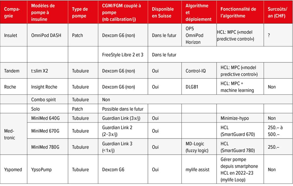 Le couplage entre pompe à insuline, système de CGM et un algorithme d’intelligence artificielle (IA) constitue une boucle fermée (Fig. 1). Ces systèmes ont la propriété d’adapter à la hausse ou à la baisse la délivrance de l’insuline en fonction du taux de glucose. Actuellement, ces systèmes sont au stade de boucle semi-fermée («hybrid closed-loop», HCL); le patient devant injecter de lui-même le bolus au moment des repas (dosage de l’insuline-repas et le timing dépendent totalement du patient). Il existe aujourd’hui trois systèmes sur le marché suisse et très prochainement deux supplémentaires (Tab. 2). Ils permettent de réduire le nombre d’hypoglycémie, améliorer le taux d’HbA1c d’environ 0,3–0,4% et diminuer la charge mentale liée à la gestion du diabète.7 Ces résultats s’observent toutefois principalement chez des individus ayant d’importantes compétences techniques et d’auto-gestion du diabète.1