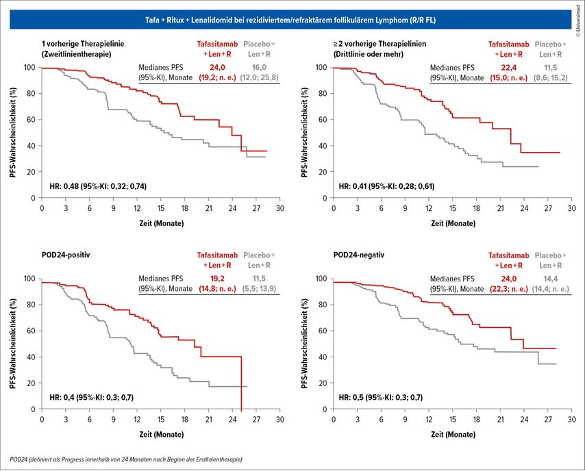 POD24-negativ: medianes PFS 24,0 vs. 14,4 Monate; HR: 0,5 (95%-KI: 0,3–0,7), refraktär gegenüber vorheriger Anti-CD20-Therapie