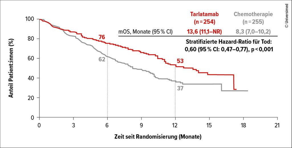 Abb. 2: DeLLphi-Studie: signifikant höhere OS-Raten und längeres mOS unter Tarlatamab (modifiziert nach Rudin CM et al.)14