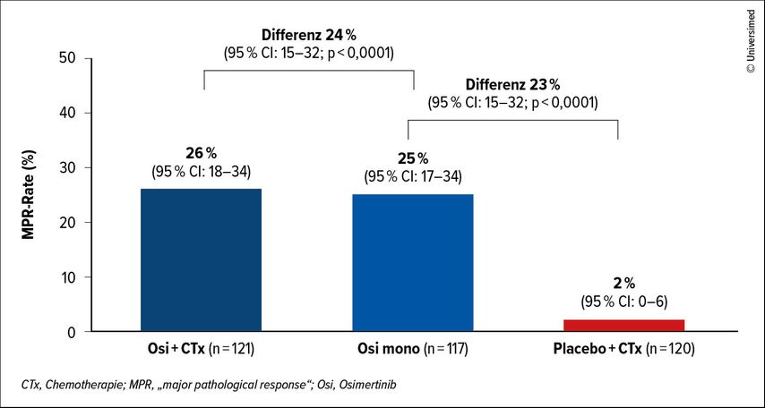 Nach der neoadjuvanten Therapie konnten 92% (Osi+CTx), 97% (Osi mono) und 89% (CTx) der Patient:innen operiert werden, wobei in jeweils mehr als 90% (Osi mono: 95%) der Fälle eine R0-Resektion möglich war. Insgesamt erhielten 91% der Operierten anschließend eine adjuvante Osi-Therapie. Die MPR-Raten betrugen 26% (Osi+CTx), 25% (Osi mono) und 2% (CTx) (Abb.1). Zudem konnte in den Osi-Armen in mehr als 50% der Fälle ein Downstaging erreicht werden (vs. CTx 21%). Die Nebenwirkungen waren konsistent mit früheren Studien.1