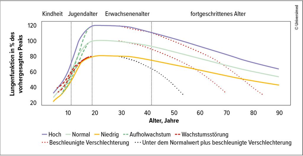 Da die meisten dieser Strategien auf die Erkennung von Patient:innen erst nach Entstehung von funktionellen und radiologischen Einschränkungen zielen, stellt sich zunehmend die Frage, ob Personen mit höherem Risiko bereits früher identifiziert werden können. Dazu hat sich in den letzten Jahren das Konzept von „lung function trajectories“ etabliert. Dieses umfasst die Überlegung, dass während des Lungenwachstums und der schließlich erreichten maximalen Lungenfunktion bereits der Grundstein zur zukünftigen Krankheitsentwicklung gelegt wird. Da die Lungenfunktion über die Lebensspanne natürlicherweise langsam abnimmt, haben Individuen, die bereits im jungen Erwachsenenalter kein optimales Lungenwachstum erreicht haben, ein höheres Risiko, im Verlauf nach Einwirken von verschiedenen Noxen eine Lungenerkrankung zu entwickeln.12 Somit kann die Krankheitsentstehung einerseits durch einen raschen Abfall der Lungenfunktion durch schädliche Noxen wie Nikotinkonsum, aber auch durch eine niedrige Ausgangsfunktion bedingt sein. Im Gegensatz dazu können Individuen mit sehr guter Lungenfunktion mehr schädliche Einflüsse kompensieren. Eine genaue longitudinale Beurteilung setzt damit aber eine regelmäßige Messung der Lungenfunktion voraus, um einen Abfall über der Norm rechtzeitig zu erkennen (Abb.2).13 Dazu wurde auch ein „lung function tracker“ der Global Lung Function Initiative vorgestellt, mit dem das Monitoring der Lungenfunktion, ähnlich dem von Wachstumsperzentilen, über eine längere Zeitspanne möglich ist.14 Um Werkzeuge wie dieses effektiv verwenden zu können, sollte somit bereits im Kindesalter regelmäßig die Lungenfunktion mittels Spirometrie bestimmt werden. Dieser Ansatz wird durch das „Healthy Lungs for Life for Schools“-Projekt der European Lung Foundation unterstützt, um neben validen Messungen auch Aufklärung zur Lungengesundheit zu betreiben. Auch bereits in Österreich wurden dafür in Wien über die LEAD-Studie mittels mobiler Spirometrie Schulkinder zwischen 7 und 14 Jahren untersucht.15
