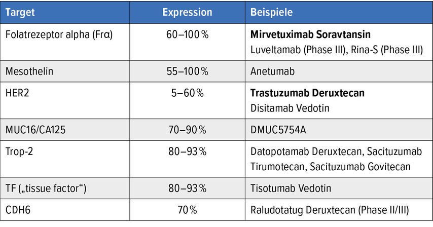Bei Auftreten einer Platinresistenz standen in der Vergangenheit unterschiedliche Chemotherapiesubstanzen mit mäßigen Ansprechraten zur Verfügung. Inzwischen wurde aber auch die Therapiewelt des metastasierten Ovarialkarzinoms durch neue Antikörper-Wirkstoff-Konjugate (ADC) bereichert (Tab.1).