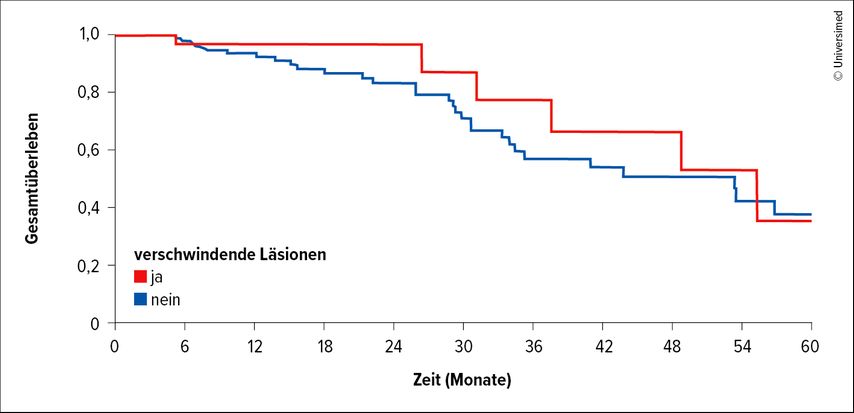 Ziele der Studie waren die Evaluation chirurgischer Outcomes und die langfristige Prognose. Von den eingeschlossenen Patient:innen zeigten 33 dCRLM, wobei 93% zuvor Biologika erhalten hatten. Im Vergleich zu Patient:innen ohne dCRLM ergaben sich keine signifikanten Unterschiede bei perioperativen Komplikationen oder Resektionsraten. Die 5-Jahres-Gesamtüberlebensrate betrug 27% für resezierte dCRLM, vergleichbar mit Fällen ohne Verschwinden der Metastasen (Abb.2).