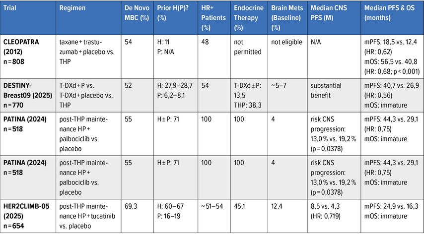 Tab. 1: Selektion bedeutender Erstlinienstudien bei metastasiertem HER2-positivem Mammakarzinom im Vergleich