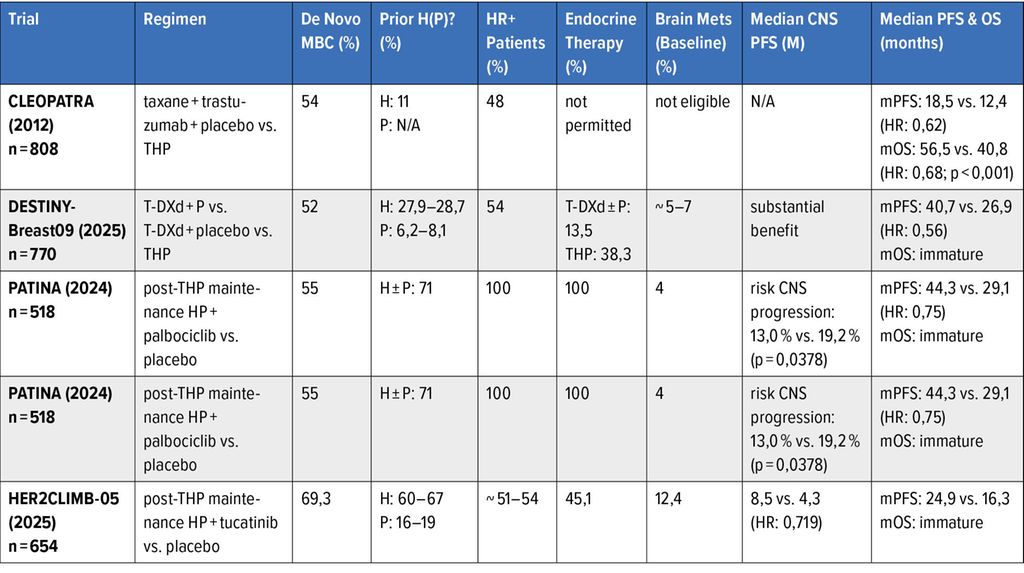 Zusätzlich zeigte allerdings der PATINA-Ansatz6 (Integration von Palbociclib-Maintenance bei HR+/HER2+ Patient:innen) PFS-Vorteile in diesen triple-positiven Fällen – auffallend in dieser Studie war das ausgesprochen hohe mediane PFS von rund 44 Monaten im experimentellen Arm. Da diese exzellenten Ergebnisse nach Taxaninduktion (+T/P) erreicht wurden, relativieren sie insofern Daten aus Destiny-Breast09. Selbiges gilt für HER2CLIMB-05-Daten,1 in denen der HR-Status, wie oben erwähnt, den therapeutischen Effekt moduliert.