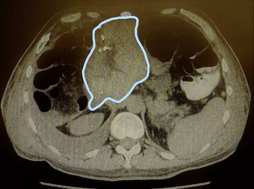 Abb. 2: Große zentrale Metastase eines Rektumkarzinoms (rosa Bereich) sowie sehr kleine linkslaterale Segmente (grüner Bereich)