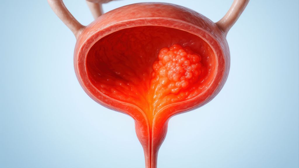 Ein 65-jähriger Mann wurde aufgrund einer schmerzlosen Makrohämaturie zur weiteren Abklärung an unsere Abteilung überwiesen. Der Patient wies keine Risikofaktoren wie Rauchen, frühere Strahlentherapie, berufliche Exposition oder familiäre Vorbelastung auf. Zudem waren keine weiteren Vorerkrankungen bekannt. Der Patient war schmerzfrei und zeigte keine B-Symptome wie Gewichtsverlust oder Nachtschweiß; auch wurden keine neurologischen Defizite berichtet.