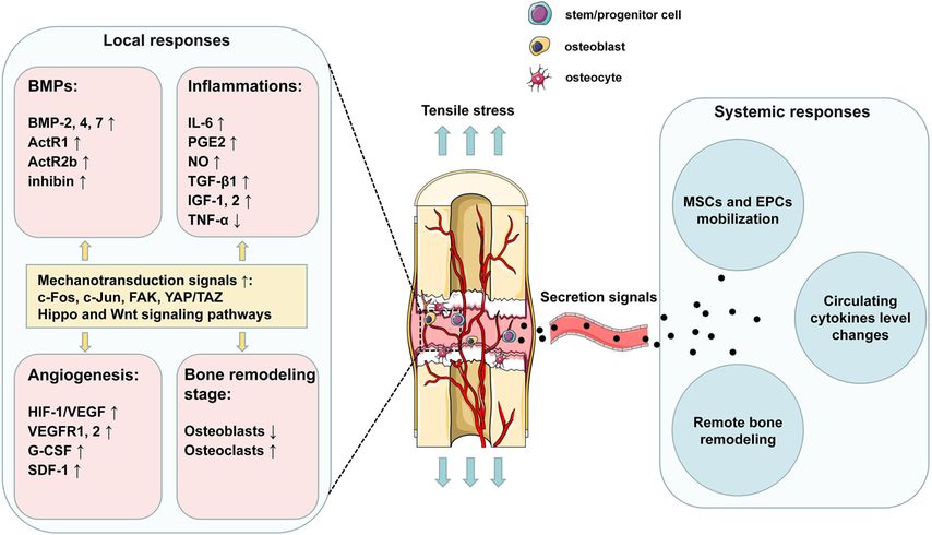 Abb. 2: Schematische Darstellung der lokalen und systemischen Reaktionen während der Distraktionshistogenese (aus Kong et al. 2020)3