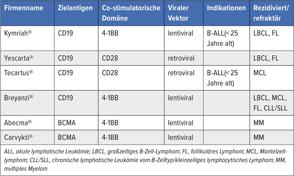 Die aktuell durch die U.S. Food and Drug Administration (FDA) und die Europäische Arzneimittel-Agentur („European Medicines Agency“, EMA) zugelassenen CAR-T-Zell-Produkte der dritten Generation bestehen aus der Antigenbindedomäne, einer Scharnierregion (engl. „hinge“), der Transmembrandomäne, einer oder mehreren kostimulatorischen Domänen (CD28, 4-I1BB bzw. CD137) sowie der CD3-zeta-Kette (Tab.1).