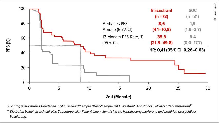 Die Monotherapie mit Elacestrant zeigte in einer explorativen Post-hoc-Analyse nach längerer CDK4/6-Inhibition + ET ≥12 Monate ein medianes PFS von 8,6 Monaten (vs. 1,9 Monate im SOC-Arm).6,**