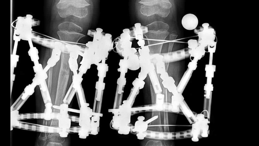 Die Knieinstabilität kann dabei, mehr als zuvor, als wichtiger Faktor in den Vordergrund rücken. Die Knieanatomie zeigt bei Achondroplasie typische Veränderungen wie häufigen Scheibenmeniskus, tiefe Trochlea und einen veränderten Kreuzbandverlauf.10 Eine Überstreckbarkeit des Kniegelenks ist häufig durch einen pathologischen tibialen Slope mitverursacht. Laterale Knieinstabilität wird durch einen typischen Hochstand des Fibulaköpfchens verursacht.11 Therapeutisch besteht die Möglichkeit, bei rekonstruktiven Eingriffen mit externen Fixateuren durch spezielle Techniken sowohl eine Fibuladistalisierung als auch eine Korrektur des tibialen Slopes (mit simultaner Knochenverlängerung) zu erreichen. Die Stabilität des Kniegelenkes kann so verbessert werden, dies führt zu einem entscheidenden Benefit in der alltäglichen Belastbarkeit und somit auch im Gangbild von Betroffenen (siehe Abb. 3).