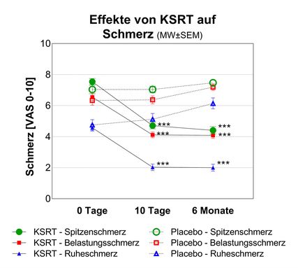 Abb. 1: Signifikante Reduktion der Schmerzintensität bei Vergleich von KSRT und Placebo 10 Tage und 6 Monate nach KSRT (***p < 0,001)