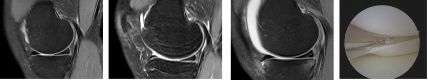 Behrendt stellte im Zuge seines Vortrags den Fall einer 25 Jahre alten Handballspielerin mit Distorsionstrauma im Mai 2023 vor. Bei einer MR-gestützten Partialruptur des vorderen Kreuzbandes mit geringer subjektiver Instabilität wurde zunächst konservativ behandelt. Im Verlauf zeigten sich jedoch zunehmende Hyperintensität am Innenmeniskus-Hinterhorn und eine Restinstabilität beim Handballspielen. Ein Jahr nach dem Unfall führte die zunehmende Symptomatik zu einem klaren Meniskusriss, sodass eine Kreuzbandersatzplastik und eine Rekonstruktion des Innenmeniskusrisses durchgeführt wurden (Abb.1). Diese Fallvignette verdeutlicht, dass nach unzureichender Versorgung eines vorderen Kreuzbandrisses das Risiko für zusätzliche Meniskus- und Knorpelschäden hoch ist. Eine Metaanalyse zeigte, dass dies in 88 % der Studien (35 von 44) auftrat. Kritische Zeitgrenzen lagen bei sechs Monaten für Meniskus- und zwölf Monaten für Knorpelschäden; danach stieg die Wahrscheinlichkeit weiterer Schädigungen deutlich an. Mit zunehmendem zeitlichem Abstand zum Kreuzbandriss verschlechtert sich zudem die Rekonstruierbarkeit der Menisken.8