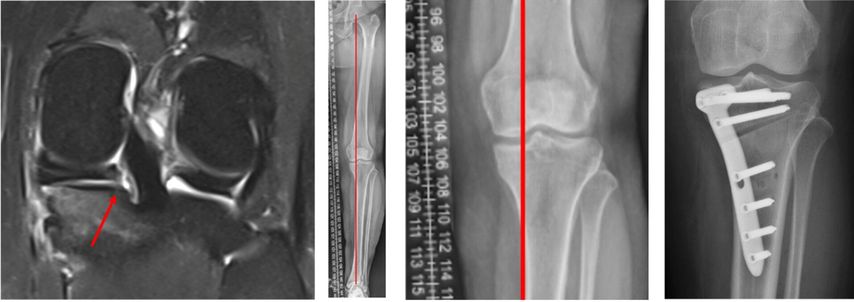 Dies verdeutlicht der Fall einer 46 Jahre alten Patientin mit atraumatischen Schmerzen im medialen Kniegelenk links (Abb. 2). In der präoperativen MRT-Diagnostik zeigt sich der degenerative Innenmeniskuswurzelriss (linkes Bild, Pfeil). In der präoperativen Röntgen-Ganzbeinaufnahme im Stehen ist ein Varus-Malalignment von 4° zu erkennen (Bilder in der Mitte). Es erfolgte eine arthroskopische Innenmeniskuswurzelrefixation mittels transtibialer Auszugsnaht, kombiniert mit einer valgisierenden medial öffnenden hohen tibialen Osteotomie (rechts).