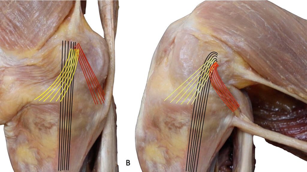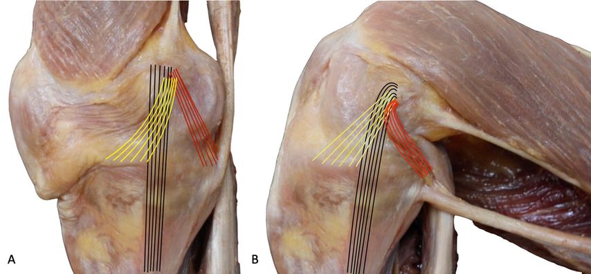 Abb. 1: Anatomie des medialen Bandkomplexes. A: gestrecktes Kniegelenk, B: gebeugtes Kniegelenk; schwarz: sMCL, gelb: AML/dMCL, rot: POL