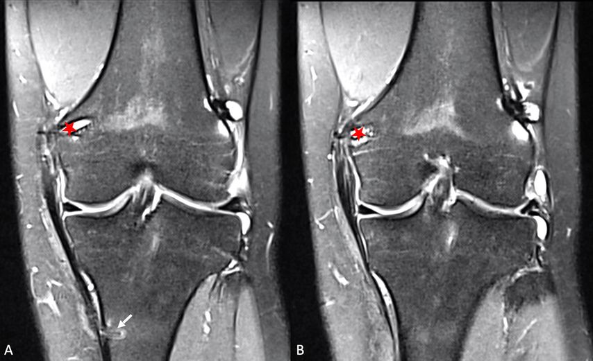 Abb. 10: MRT-Kontrolle 6 Monate postoperativ. A, B: 2 aufeinanderfolgende Schichten einer koronaren STIR-Sequenz einer eingeheilten sMCL-Rekonstruktion mit femoraler Schraubenfixation (roter Stern) und Fadenanker distal (Pfeil)
