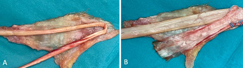 Abb. 4: Abpräparierter medialer Seitenbandkomplex, bestehend aus sMCL und POL. A: sMCL oben und POL nach schräg unten verlaufend mit tubulärem Transplantat, wie es zum Ersatz positioniert würde, und B: mit flachem Transplantat, welches den Faserverlauf wesentlich besser reproduzieren kann