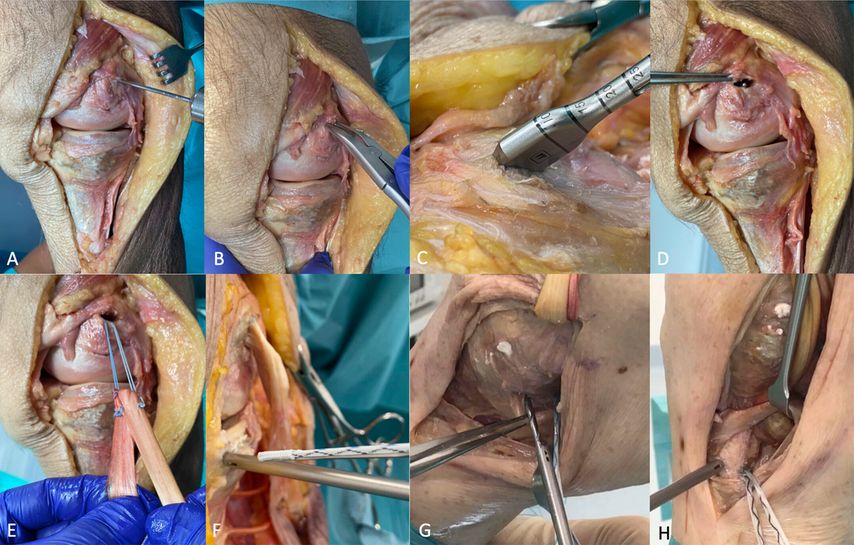 Abb. 7: Operationsschritte zur Rekonstruktion von sMCL und AML bzw. sMCL und POL. A: Platzieren eines Führungsstiftes zentral im femoralen Ansatzbereich des sMCL. B: Entfernen der Kortikalis mit einem Luer parallel zur Gelenkslinie in voller Streckung ventral und dorsal des Führungsstiftes. C: Einbringen des flachen Dilatators über den Führungsstift. D: Ovaler femoraler Kanal parallel zur Gelenkslinie. E: Einziehen des Transplantates für eine sMCL/AML-Rekonstruktion mit dem tiefen, nach vorne verlaufenden Schenkel unten und dem oberflächlichen Anteil hinten. F: Einbringen eines Fadenankers circa 8 mm unterhalb der Gelenkslinie ventral des sMCL im Insertionsbereich des AML. G: Einbringen eines Fadenankers unmittelbar proximal des Semimembranosusansatzes (mit Pinzette angehoben) zur Rekonstruktion eines POL. H: Einbringen von 2 Fadenankern im distalen Insertionsbereich des sMCL unterhalb des Pes anserinus (mit Langenbeck-Haken nach oben gehalten)