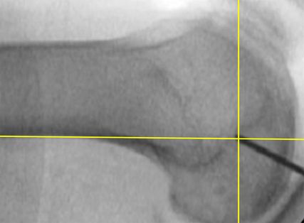 Um der breiten femoralen Insertion des medialen Seitenbandkomplexes näher zu kommen, wird mithilfe eines Dilatators ein schlitzförmiger Kanal parallel zur Gelenkslinie in voller Streckung angelegt (Abb. 7D). Hierfür wird primär ein Bankart-Stift im Zentrum des Insertionsareals eingebracht (Abb. 7A), der mit einem 4,5-mm-Bohrer überbohrt wird. Sind in einer chronischen Instabilitätssituation keine Bandreste im Insertionsbereich mehr darstellbar, kann ein streng seitliches Röntgenbild mit zwei Hilfslinien das Auffinden des idealen Eintrittspunktes erleichtern (Abb. 6).