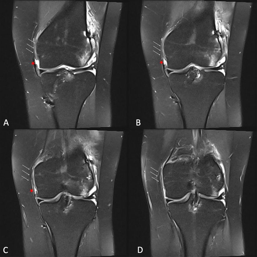 Abb. 3: MRT-Untersuchung einer chronischen medialen Instabilität. A–D: 4 aufeinanderfolgende Schichten einer koronaren STIR-Sequenz zeigen das ausgedünnte bzw. vernarbte sMCL am femoralen Ansatz (Pfeile) und den Defekt im meniskofemoralen Anteil des dMCL (roter Stern)