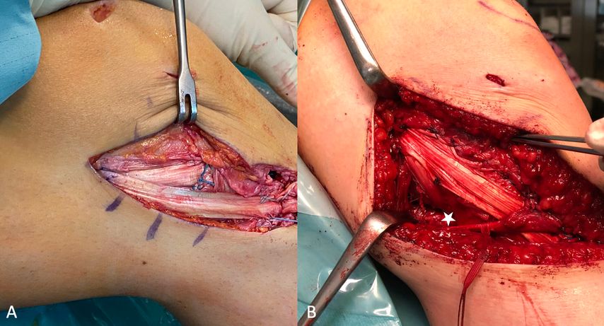 Abb. 8: Intraoperativer Situs bei Rekonstruktion des medialen Seitenbandkomplexes. A: sMCL- und AML-Rekonstruktion; B: sMCL- und POL-Rekonstruktion. Semimembranosusinsertion (Stern)