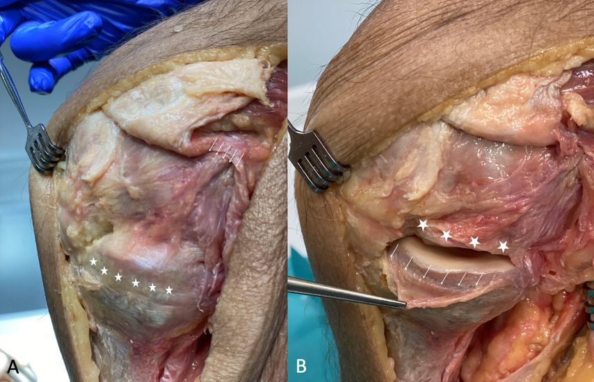 Abb. 2: dMCL. A: Verlauf des dMCL in der gesamten Ausdehnung mit seinem femoralen (Pfeile) und weit gefächerten tibialen Ansatz (Sterne). Der schräg nach vorne verlaufende Anteil ist besonders für die Limitierung der Außenrotation verantwortlich (AML). B: Nach Durchtrennung des dMCL unterhalb des medialen Meniskus (Sterne) wird die Insertion knapp unterhalb der Gelenkslinie (Pfeile) sichtbar