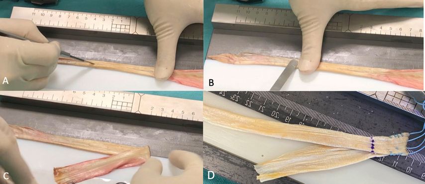 Abb. 5: Präparation eines flachen Transplantates. A: Das Semitendinosus-Transplantat wird in seinem tubulären Anteil bis zur Hälfte inzidiert und anschließend B: mit einem Raspatorium flach ausgestrichen. C: Das Transplantat wird 1/3 zu 2/3 in einem Winkel von 45° gefaltet. D: mit Krackow-Nähten armiertes fertiges Transplantat