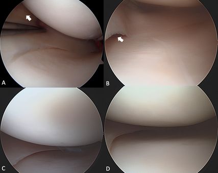 Abb. 9: Arthroskopisches Bild einer medialen Instabilität. A: proximale Instabilität mit meniskofemoraler Dehiszenz (Pfeil) und C: postoperatives Bild nach Rekonstruktion. B: distale Instabilität mit meniskotibialer Dehiszenz (Pfeil) und D: postoperatives Bild nach Rekonstruktion