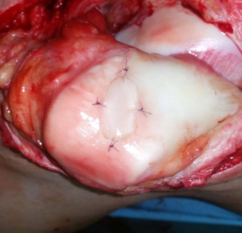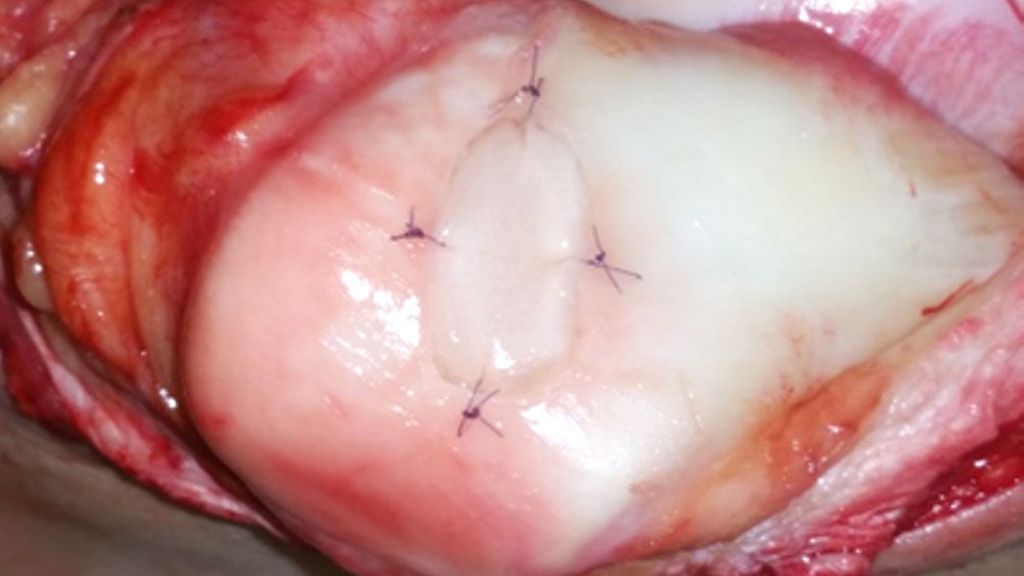 Abb. 1: MACT an einem retropatellaren Knorpeldefekt, Fixation des Transplantates an den umliegenden Knorpel mit resorbierbaren Fäden