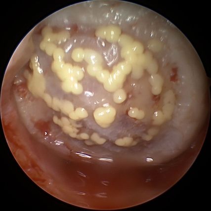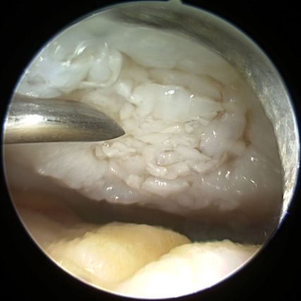 Abb. 2: In einen Knorpeldefekt am medialen Femurknodyl arthroskopisch implantierte Sphäroide (Spherox®)
