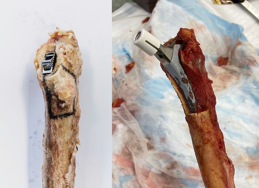 Mithilfe einer oszillierenden Säge und in einem standardisierten Verfahren wurde in der Frakturgruppe eine Clamshell-Fraktur simuliert, welche 40% der craniocaudalen Verankerungsstrecke des jeweiligen Schaftes fasste. Dieses Ausmaß wurde anhand des „Remaining Attachment“-Index gewählt, welcher exakt dieses Verhältnis als Cut-off für die Stabilität des Schaftes beschreibt und somit eine Unterscheidung zwischen Vancouver-A- und Vancouver-B-Frakturen ermöglicht (Abb. 1, 2).7