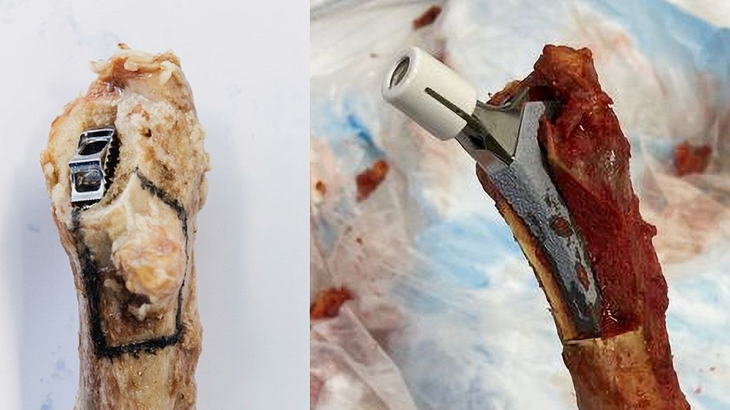 Es wurden 11 Paare von frisch eingefrorenen (–20°) menschlichen Oberschenkelknochen randomisiert paarweise in zwei Gruppen aufgeteilt. In der nativen Gruppe wurde der Schaft gemäß den Richtlinien des Herstellers implantiert. In der Frakturgruppe wurde vor der Implantation der Originalschäfte ein Clamshell-Frakturmodell erzeugt. Verwendet wurde ein ANA.NOVA® SL-complete® Pressfit-Schaft mit einem CCD-Winkel von 127°, welcher zementfrei implantiert wurde.
