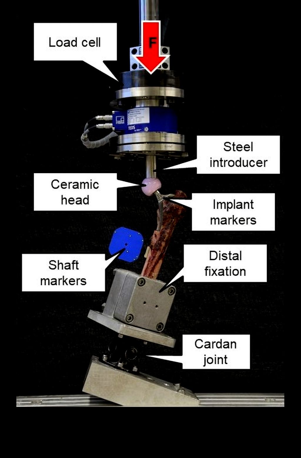 Für die biomechanischen Tests wurde das servohydraulische Prüfsystem Bionix 858 (MTS® Systems) verwendet. Sowohl Testdesign als auch das biomechanische Testprotokoll wurden bereits in früheren Studien verwendet und speziell an unsere Testungen angepasst.8 Die Specimen wurden, wie in Abbildung 3 ersichtlich, in 20°-Adduktion fixiert und unter zyklisch zunehmender Belastung getestet. Sowohl am Femurschaft als auch an der Prothese, direkt unter dem Kopf, wurden Motion-Tracking-Marker angebracht (Abb. 3) Dies ermöglichte die Berechnung der axialen Verschiebung und der Bewegung in der koronaren Ebene des Implantats relativ zum Femur. Anhand dieser Daten wurden die Belastung, die Zyklen und das jeweilige Vielfache des Körpergewichts bei einer axialen Verschiebung von 1mm, die als der Punkt beschrieben wird, an dem es zu einer Lockerung des Schafts kommt, gemessen.