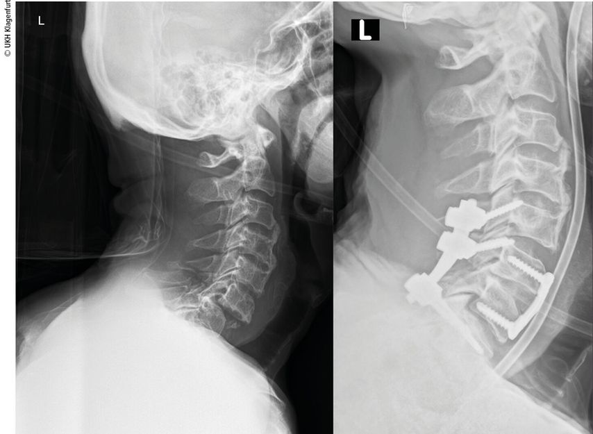 Eine operative Versorgung bei traumatischer Querschnittlähmung sollte von einem qualifizierten Wirbelsäulenteam möglichst zeitnah und laut Leitlinien spätestens 24 Stunden nach Unfall erfolgen, sobald die Vitalparameter stabilisiert wurden, um das bestmögliche neurologische Outcome zu erreichen. Eine ultrafrühe Dekompression innerhalb der ersten 8 Stunden scheint den AIS zu verbessern, die Datenlage ist jedoch noch nicht ausreichend.2 Bei einem Polytrauma ohne neurologische Verletzungen sollte eine operative Stabilisierung innerhalb von 72 Stunden durchgeführt werden.4 Grundsätzlich bestehen in diesem Zusammenhang zwei Möglichkeiten einer operativen Versorgung. Zum einen von ventral und zum anderen von dorsal oder eine kombinierte Versorgungstechnik. Die ventralen Optionen sind die ACDF („Anterior Cervical Discectomy & Fusion“) und die ACCF („Anterior Cervical Corpectomy & Fusion“). Die dorsalen Optionen sind die „Massa-lateralis-Schrauben“ und die „Pedikelschrauben-Osteosynthese“.