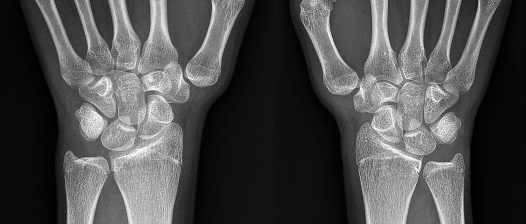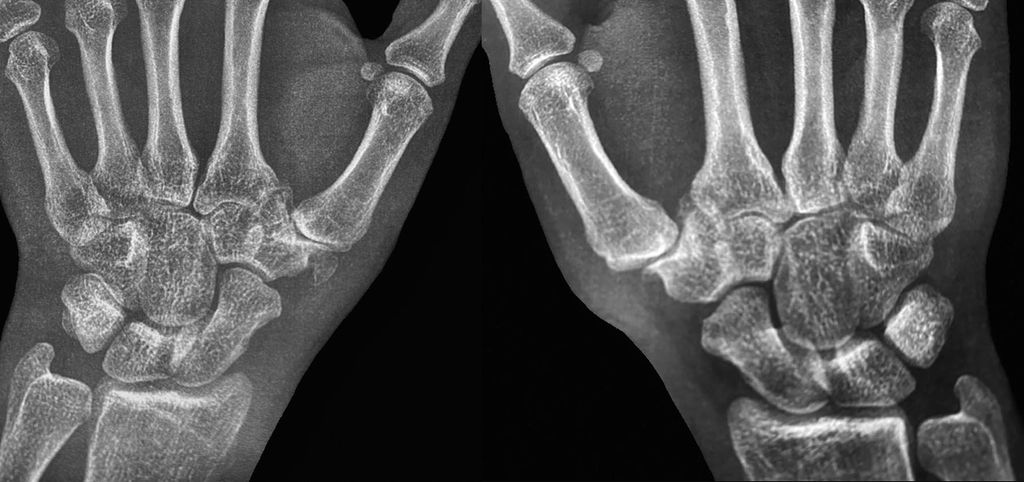 Abb. 1: Handgelenksröntgen einer 16-jährigen Patientin mit schmerzhafter CMC1-Instabilität rechts und deutlicher Trapeziumhypoplasie beidseits
