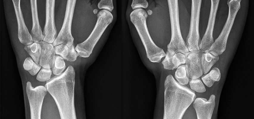 Abb. 2: Röntgen (Handgelenk a.p.) einer jungen erwachsenen Patientin mit manifester Rhizarthrose und Hypoplasie des Os trapezium beidseits. Der verminderte Gelenksabstand und die veränderte Basis des ersten Metacarpale links sind eindeutig ersichtlich (Eaton-Littler-Grad II). Rechts liegt ein verbreiterter Gelenksspalt entsprechend Grad I vor13