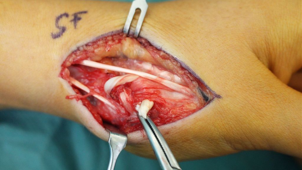 In vielen Fällen sind konservative Therapieversuche nicht ausreichend, da eine bestehende Instabilität des Gelenkes mit Folgeerscheinungen, z.B. incip. Rhizarthrose, einhergeht.12 Etliche chirurgische Verfahren stehen zur Rekonstruktion des CMC1-Gelenkes zur Auswahl.14 Historische Operationstechniken wurden von alternativen Operationsprinzipien abgelöst. Zum Einsatz kommen Verfahren, die einen Teil der Flexor-carpi-radialis(FCR)-Sehne verwenden, z.B. die modifizierte Eaton-Littler-Technik15, oder einen Teil der Abductor-pollicis-longus(APL)-Sehne, wie an unserer Klinik, oder andere Strukturen, wie z.B. Palmaris longus16 oder Anteile des Retinaculum extensorum17.