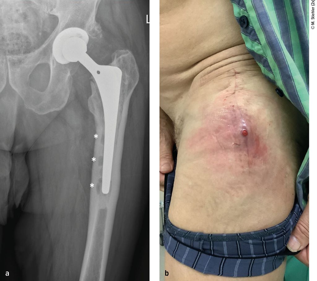 Abb. 1: Patient mit chronischer Hüftendoprotheseninfektion. Radiologisch zeigen sich infektionsbedingte periprothetische Osteolysen (*, a) und klinisch imponiert eine kutane Fistel (b).