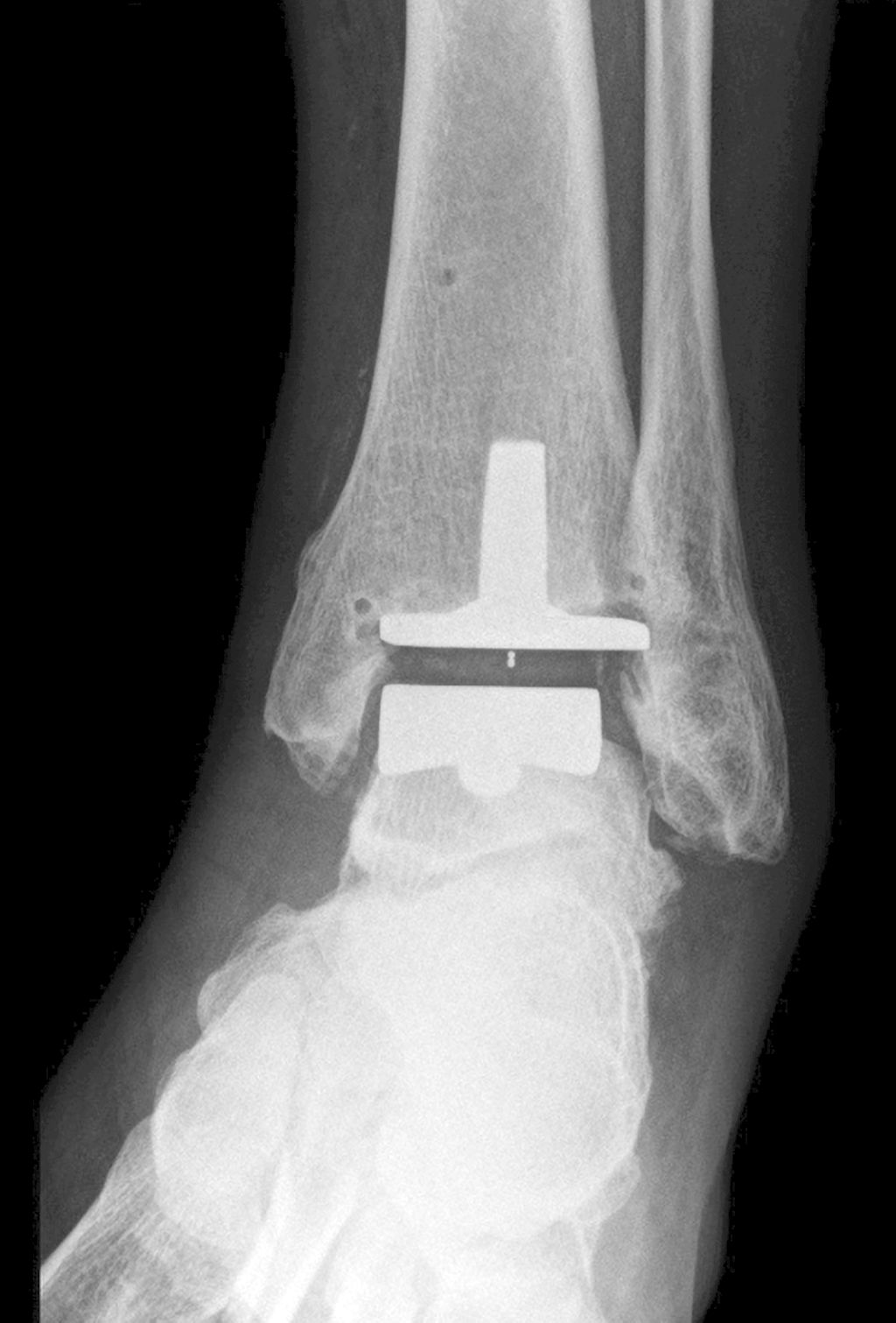Prinzipiell bestehen bei Prothesenversagen am OSG die Möglichkeiten einer Prothesenrevision, einer Arthrodese sowie einer Amputation. Entscheidende Faktoren sind die vorhandene Knochensubstanz insbesondere des Talus, Anschlussdegenerationen sowie kompromittierte Weichteile. Wenngleich die Revisionsraten nach Prothesenwechsel mit 26,9% und nach sekundärer Arthrodese mit 13% höher als nach primärer Versorgung sind,15 zeigt sich eine deutliche Verbesserung der Funktionsscores nach beiden Verfahren. Eine Amputation ist nur in seltenen Ausnahmefällen (<0,1%) erforderlich.
