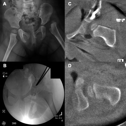 Abb. 3: 2½-jähriges Mädchen mit linksseitiger Hüftluxation. Es wurden eine offene Reposition des Hüftgelenks sowie eine Salter-Beckenosteotomie durchgeführt. A) Beckenübersicht Röntgen präoperativ; B) intraoperatives Röntgenbild; C, D) coronale und axiale intraoperative 3D-Bildwandler-Rekonstruktion