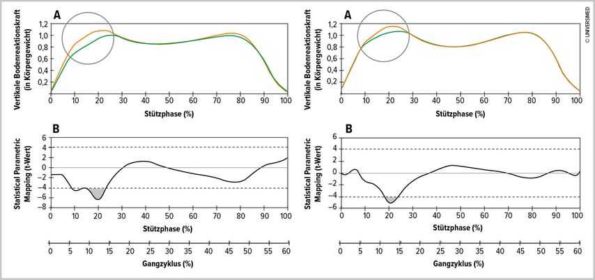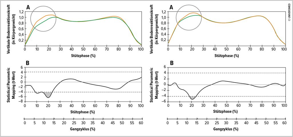 Abb. 2: Bereiche A zeigen jeweils die mittleren Bodenreaktionskräfte (orange: nicht operiert, grün: operiert) vor (links) und nach (rechts) einer dreiwöchigen funktionellen Elektrostimulation des M. quadriceps. Zu beachten ist die Annäherung der beiden Kurven am Ende der Intervention (siehe Kreise). Bereiche B zeigen jeweils die t-Statistik mit den grau schattierten Flächen der SPM-Analyse, welche die signifikanten Unterschiede zwischen den Beinen und deren Verringerung durch die Intervention verdeutlichen