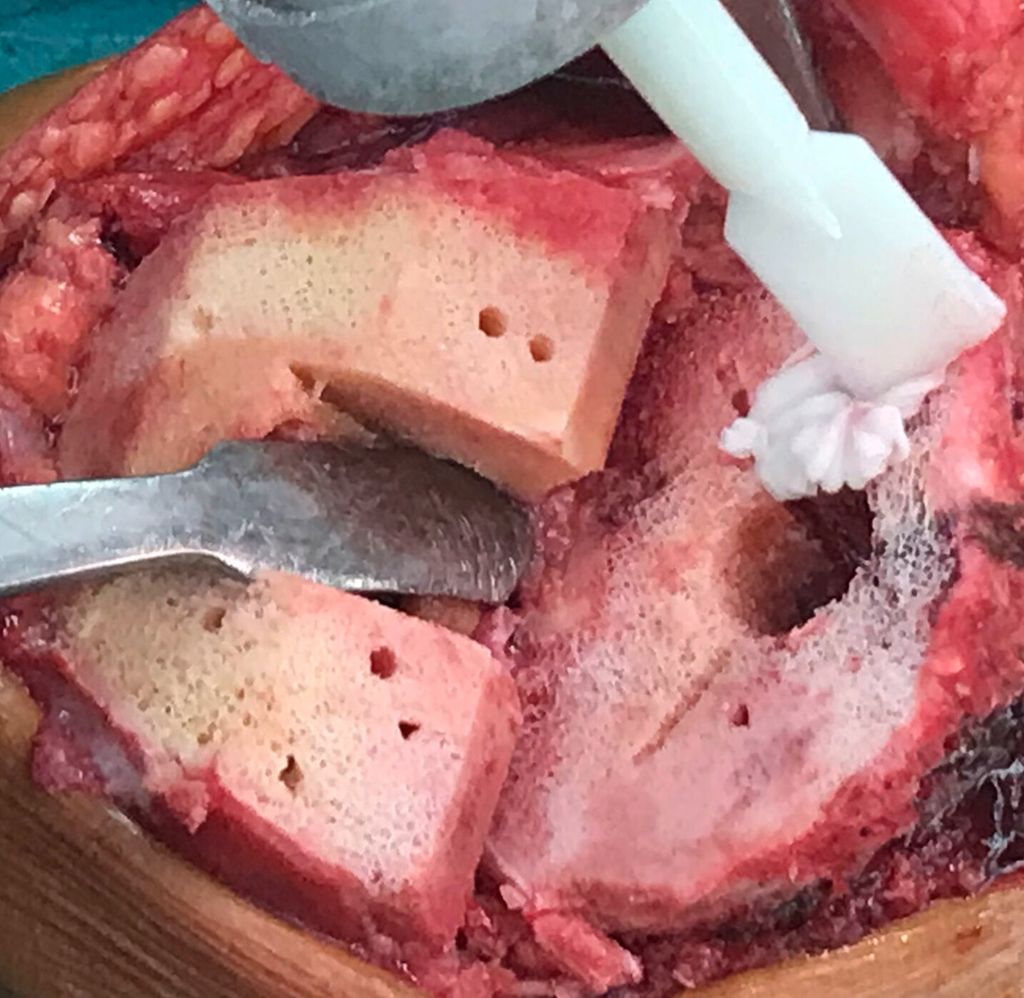 Es ist mittlerweile unbestritten, dass die Knochenoberfläche mit einer Jet-Lavage gereinigt werden muss, um eine möglichst großflächige Verankerung des Zementes in der offenen Spongiosa zu erreichen. Mit kleinen Bohrungen können hierzu sklerotische Knochenareale vorbehandelt werden.6