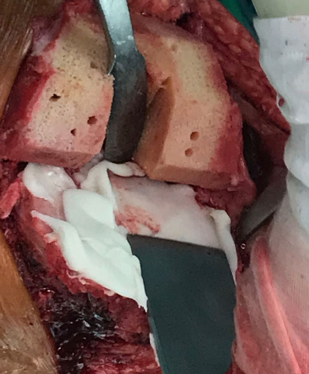 Im Vergleich zur Hüftendoprothetik ist ein Einpressen des Zementes in die Spongiosa des Knies über 1 Minute nur sehr schwer möglich. Bei Verwendung eines flachen Zementspritzenaufsatzes kann der Zement aber orthograd in die Spongiosa eingepresst werden (Abb. 2). Danach ist ein Nachpressen mit einem sauberen Meißel zu empfehlen (Abb. 3). Zumindest erreicht man mit dieser Technik ein deutlich besseres Eindringen des Zementes in die Spongiosa. Diese Technik verwendet der Autor bei hochviskösem Zement.