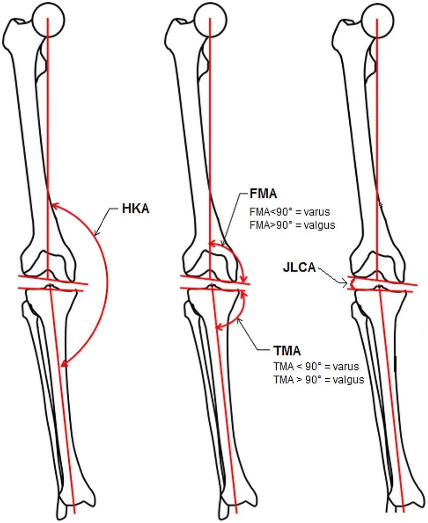 Abb. 1: Alle Winkel sind medial gemessen. Der „hip-knee-ankle angle“ (HKA) ist der Winkel zwischen der mechanischen Achse des Femurs und der mechanischen Achse der Tibia. Der „femoral mechanical angle“ (FMA) ist der Winkel zwischen der mechanischen Achse des Femurs und der Tangente der distalen Femurkondylen. Der „tibial mechanical angle“ (TMA) ist der Winkel zwischen der mechanischen Achse der Tibia und der Tangente der proximalen Tibiaoberfläche. Der „joint-line convergence angle“ (JLCA) ist der Winkel zwischen der Linie der distalen Femurkondylen und der proximalen Tibiaoberfläche