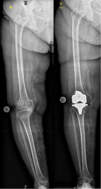 Abb. 2: Patientin mit Varus präoperativ (HKA=162°). Aufgrund der ausgeprägten Fehlstellung wurde entschieden, über einen medialen Zugang vorzugehen und einen milden Varus beizubehalten
