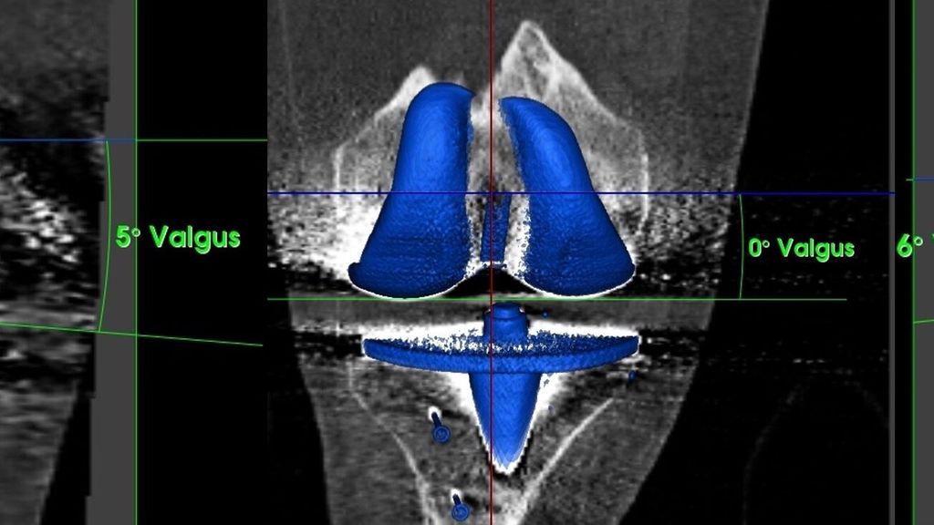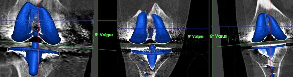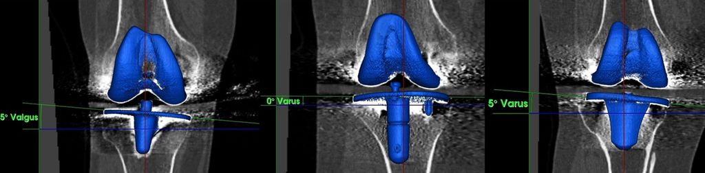 Abb. 3: Koronales Alignment der Femurkomponente nach konventioneller TKE, gemessen an 3D-rekonstruierten CT-Aufnahmen mit einer handelsüblichen Software.30 Das Ziel war bei allen Patienten ein MA mit einer neutralen Beinachse