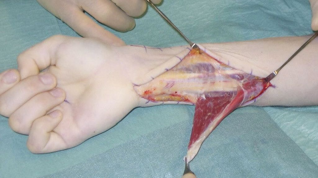 Rekonstruktion von Daumenextension und -abduktion: Um die Abduktion und Streckfunktion des Daumens zu rekonstruieren, wird meist der Palmaris longus (PL) über einem queren Hautschnitt in der Beugefurche des Handgelenks vor dem Karpaltunnel abgetrennt, freigelegt und unter Spannung mit den geschlitzten Sehnen des M. extensor pollicis brevis (EPB) und des M. abductor pollicis longus (APL) am palmaren Rand der Tabatière vernäht.