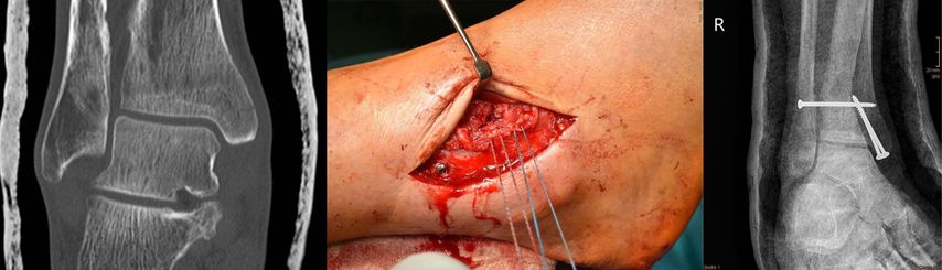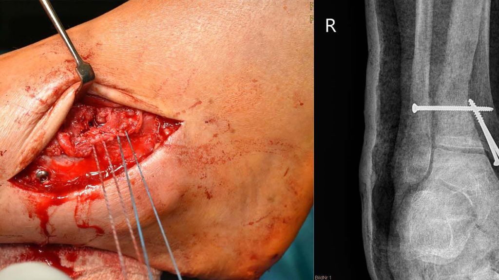 Abb. 1: Erstdiagnose: undislozierte Innenknöchelfraktur. Intraoperativ: instabile Maisonneuve-Verletzung (= Innenknöchelfraktur + proximale Fibulafraktur), rupturiertes eingeschlagenes AITFL, Naht AITFL nach Stellschraubeneinbringung, Innenknöchel-Verschraubung