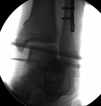 Die Kontrolle der Reposition und Stabilisierung wird unter exakter Einstellung des Sprunggelenks unter Bildwandler durchgeführt. Die Einbringung der Stellschraube erfolgt bei in Reposition temporär mit Bohrdraht fixierter Fibula, um Fehlzentrierung zu vermeiden.16