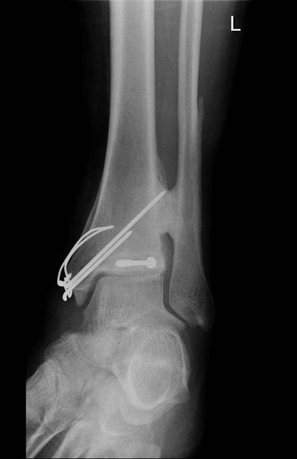 Moore und Hamid stellten jedoch fest, dass das Belassen der Syndesmoseschraube, selbst bei Schraubenbruch, das klinische Ergebnis nicht beeinflusst.28,29 Daher konnte die Belastung nach 6–10 Wochen ohne routinemäßige Schraubenentfernung zugelassen werden.